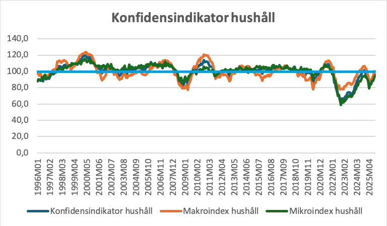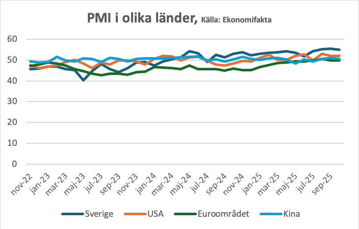 Den svenska ekonomin utvecklades svagare än förväntat under första halvåret 2025 men snabbstatistik från SCB indikerar att det kan komma att bli en överraskande stor tillväxtuppgång under tredje kvartalet. Hushållen har hållit hårt i plånboken trots att räntan sänkts påtagligt av Riksbanken. Framöver talar stigande reallöner, fallande bostadsräntor och en mycket expansivare finanspolitik för att konsumtionen tar fart. De framåtblickande indikatorerna talar också för att tillväxten i den svenska ekonomin blir mycket starkare under andra halvåret 2025 än under första halvåret. Det talar också för en starkare ekonomisk aktivitet under 2026. Denna bild verifieras av Konjunkturinstitutets barometerundersökningar, då den så kallade barometerindikatorn förstärkts påtagligt under hösten 2025, och nått det historiska genomsnittet.