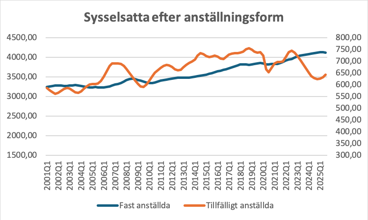 Den svagare ekonomiska aktiviteten ledde till en försvagad sysselsättningen under 2024, men under 2025 har nedgången upphört, och bedömningen framöver är att sysselsättningen ökar undan för undan. Det är tillfälligt anställda som svarat för hela nedgången av sysselsättningen, vilket alltid är fallet när konjunkturen viker. Det drabbar dem som är på väg in på arbetsmarknaden såsom ungdomar och utrikesfödda. Däremot har fast anställda klarat sig bra under innevarande försvagning. Det kan sammanhänga med att företagen väljer att behålla arbetskraft då huvudproblemet före nedgången var liten tillgång på arbetskraft. Den sysselsättningsökning som förutses kommer till en början att avse tillfälligt anställda, vilket påverkar dem som är på väg in på arbetsmarknaden positivt.